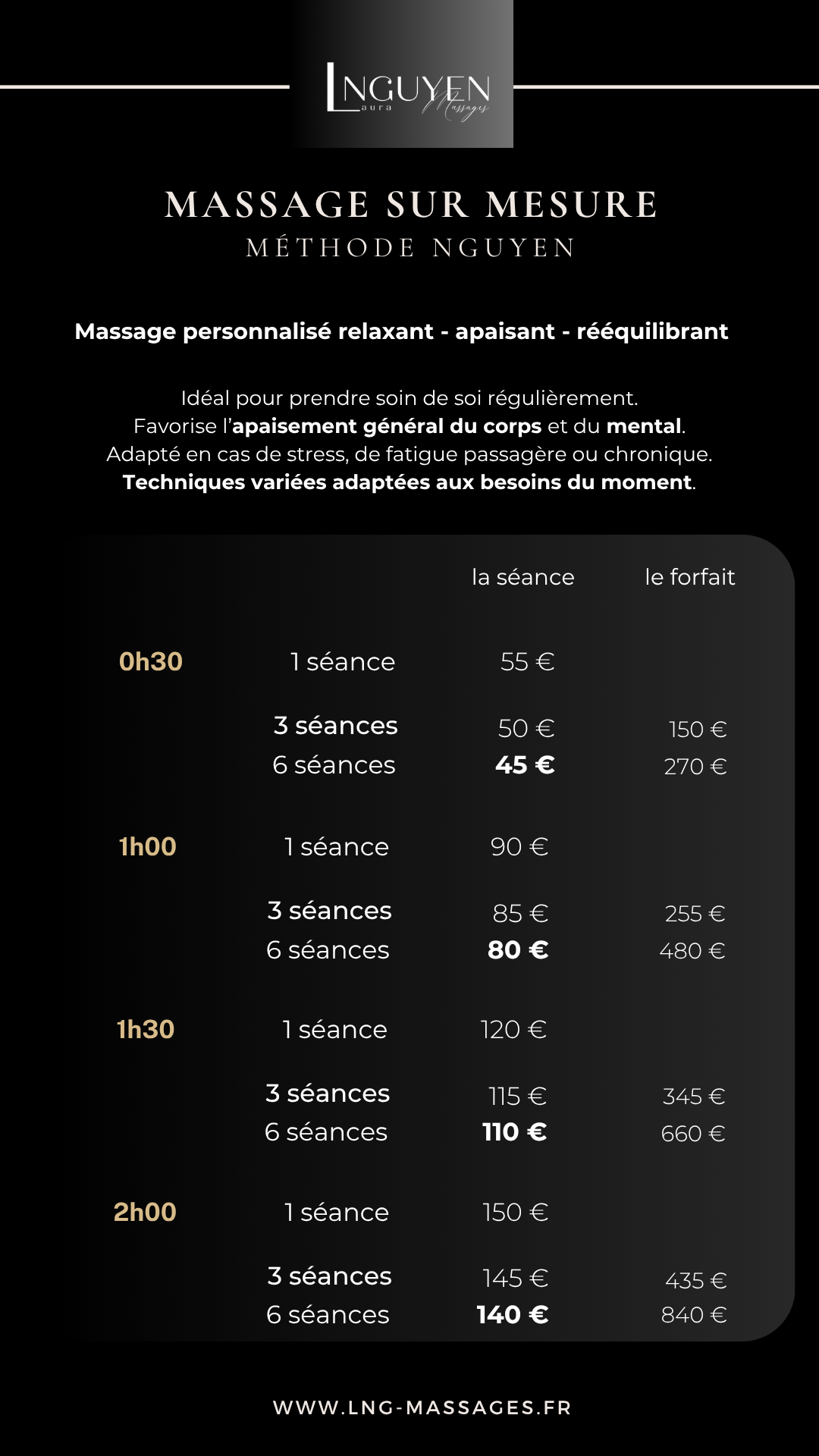 Vous ressentirez les bienfaits du massage dès la première séance. Vous vous sentirez apaisé et plus léger physiquement et émotionnellement.